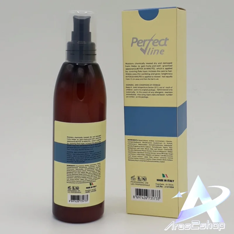کراتین و بوتاکس مو , راهی برای احیا و بازسازی موهاست. کرم مو ۱۵ کاره پرفکت لاین یک محصول فوق العاده برای مصارف حرفه ای بوتاکس و کراتین کردن مو است. موهای خشک و آسیب دیده را احیا می کند و باعث ترمیم فیبر مو میشود. کرم مو پرفکت لاین حاوی مواد مغذی و عصارههای طبیعی و گیاهی است، که موهایی سالم و زیبا را به شما می بخشد و باعث بهبود مقاومت مو میشود. موهای آسیب دیده را احیا و بازسازی کرده و بافت مو را آبرسانی و هیدراسیون میکند. کرم مو ۱۵ کاره پرفکت لاین، موهایی صاف و درخشان را به ارمغان آورده و یک نرم کننده فوق العاده مو است.